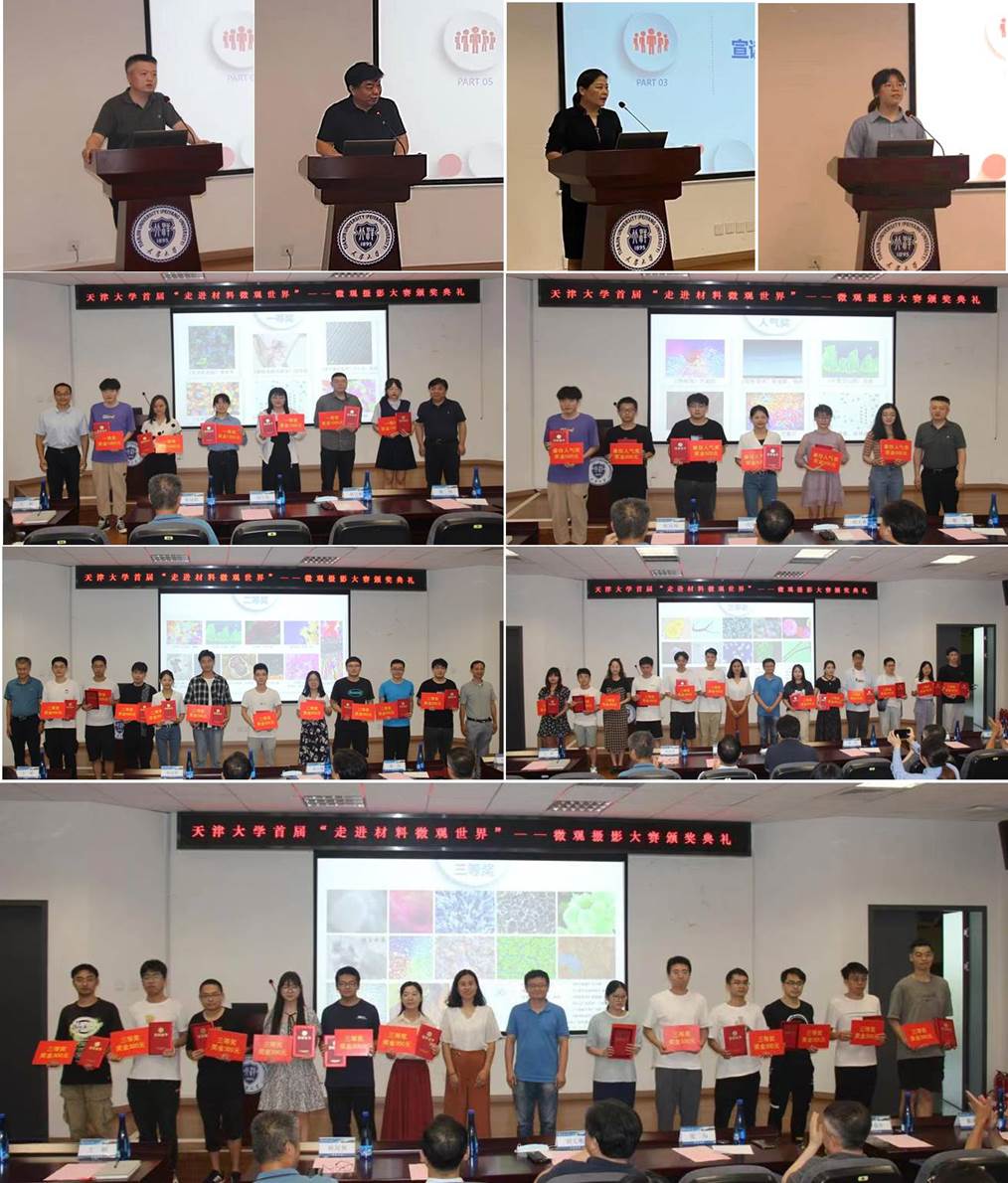 6月17日下午,大赛颁奖典礼在材料学院2106报告厅举行。典礼由材料学院国家级实验教学示范中心毛晶老师主持,天津大学资产与实验室管理处张为副处长,天津大学材料学院院长胡文彬,天津大学材料学院党委书记尚宇光,天津大学材料学院副院长耿延候、何春年、韩曼瑜,天津大学材料学院党委副书记王颖,化工学院大型仪器测试平台副主任靳凤民出席了此次典礼。张为副处长评价此次大赛顺应了国家加强高等学校实践教学、实践育人的要求,加强了不同专业、不同领域学科的交流和进步,展现了参赛学生们的科学素养和创新精神。对本次大赛给予了高度肯定。韩曼瑜副院长主持学生颁奖仪式。眭思密同学作为获奖学生代表发言,分享了此次大赛的心得和体会。最后,胡文彬院长发表总结讲话,向本次大赛中的工作人员和评委老师以及各支持单位表示衷心的感谢,向获奖的同学表示热烈的祝贺。寄语同学们能永葆初心,在科研路上砥砺前行,真正认识到科学和材料的魅力所在!