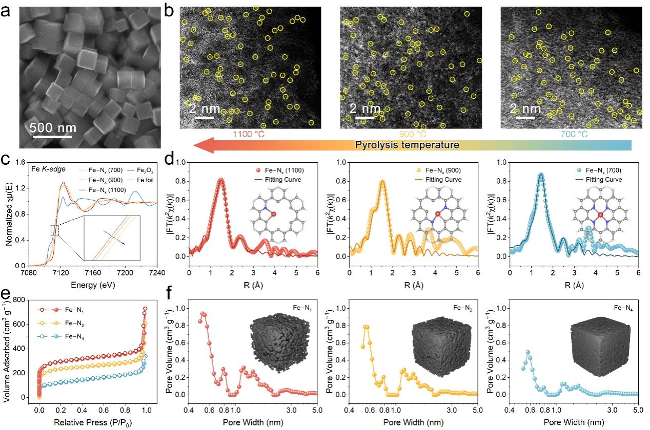 a Fe-Nx (1100)的SEM图像。b Fe-Nx的HAADF-STEM图像,其中原子分散的铁物种以黄色圆圈标出。c Fe-Nx、Fe2O3和Fe箔的Fe K边的XANES光谱。d Fe-Nx的EXAFS光谱和拟合曲线。插图为拟合模型,其中红、蓝和灰色分别代表Fe、N和C原子。e-f Fe-N1、Fe-N2和Fe-N4的N2吸脱附等温线(e)和相应的孔径分布(f)。