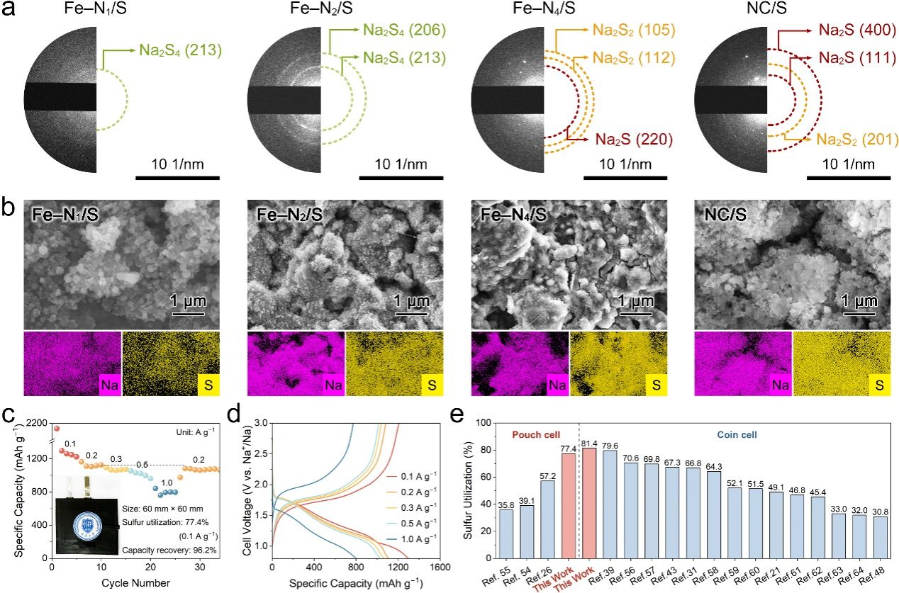 a-b 经过循环后的Fe-N1/S、Fe-N2/S、Fe-N4/S和NC/S正极的SAED花样(a)、SEM图像及相应EDS图谱(b)。c-d 采用Fe-N1/S正极的Na||S软包电池的倍率性能(c)及相应的GCD曲线(d)。e 基于Fe-N1/S正极的Na||S电池与最先进的Na||S扣式电池、软包电池的硫利用率比较。