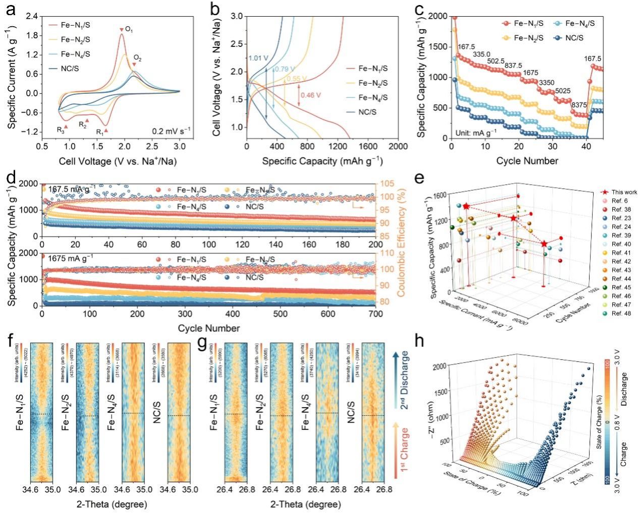 a-d 由Fe-N1/S、Fe-N2/S、Fe-N4/S、NC/S正极组装的Na||S电池在0.2 mV s-1时的CV曲线(a)、167.5 mA g-1时的充放电曲线(b)、倍率性能(c)及循环性能(d)。e Fe-N1/S正极与已报道的最先进Na||S电池正极的硫利用率、倍率及循环性能比较。f-g 第一次充电及第二次放电过程中Fe-N1/S、Fe-N2/S、Fe-N4/S、NC/S正极的Na2S(f)和Na2S5(g)处的原位XRD谱图。h Fe-N1/S正极组装的Na||S电池的原位EIS谱。