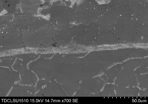 作品介绍:样品材料为316L+20#双金属复合管。主要应用在油气运输领域。采取合适的浸蚀方法,对耐蚀性相差较大的两种金属进行浸蚀,同时保证界面两侧组织清晰可见。碳钢和不锈钢组成的的接界处就像是阿拉斯加海湾的双色海洋。在阿拉斯加海湾遇见双色海洋是很幸运的事情,希望在科研路途中遇到“双色海洋”能够带给我们无限好运,鼓励我们不断前行。