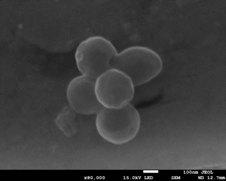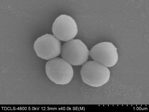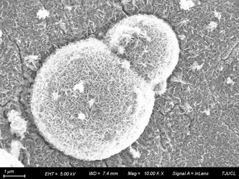 作品介绍:材料是金黄色葡萄球菌。样品制备过程主要是金黄色葡萄球菌的培养、固定和脱水。金黄色葡萄球菌由实验室培养,加入2.5%戊二醛固定4小时,用PBS离心洗涤3次,然后分别用不同浓度的乙醇离心脱水,将样品滴到硅片上自然风干。由于金黄色葡萄球菌导电性较差,进行100 s的喷金,最后把硅片贴到样品台用于扫描电子显微镜拍摄。寓意着丰收和收获。