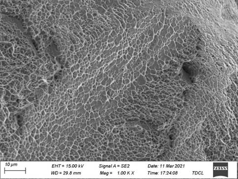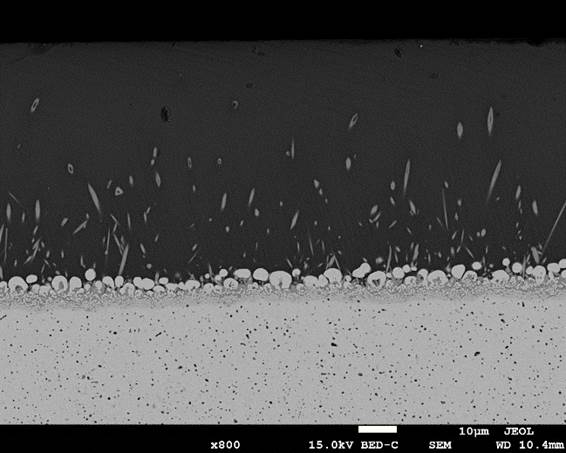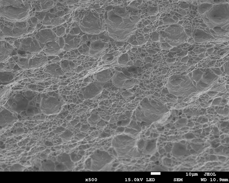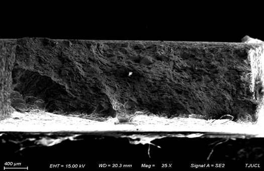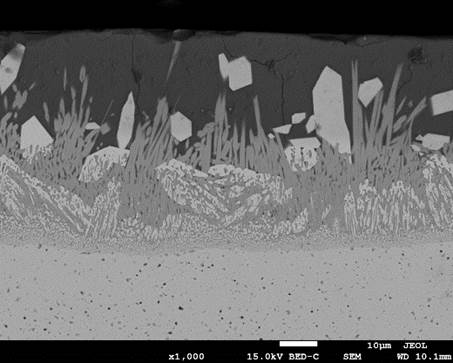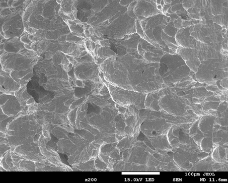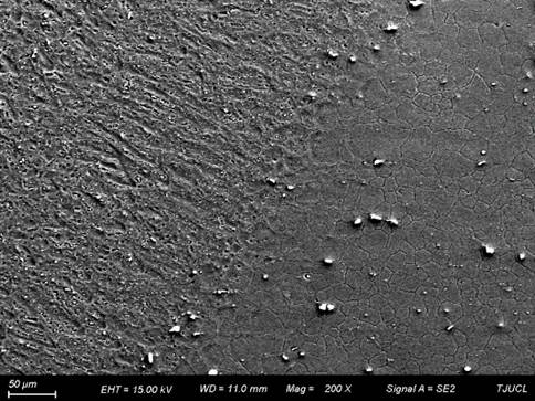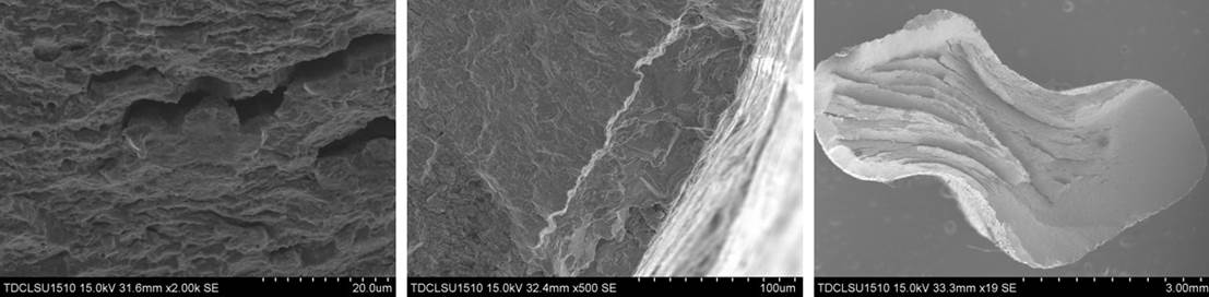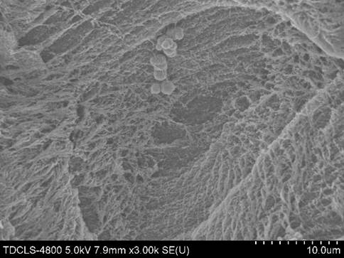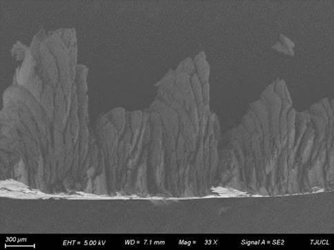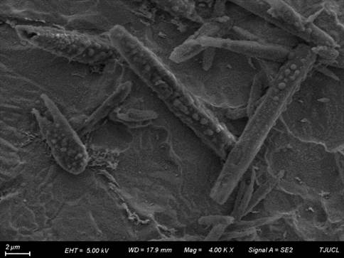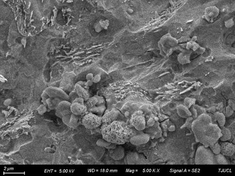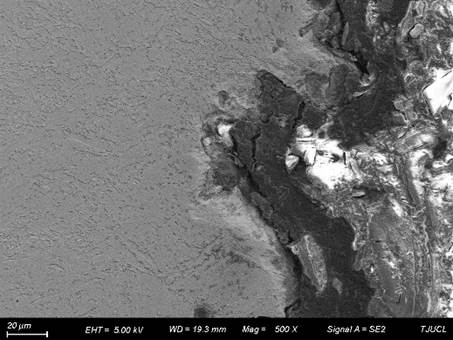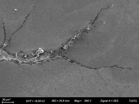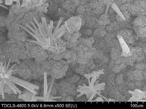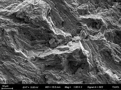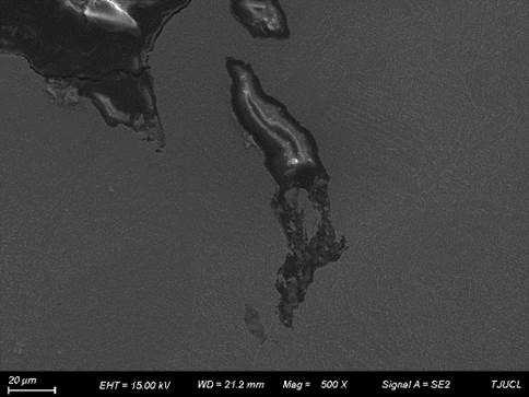 作品介绍:X65焊接接头腐蚀疲劳断口形貌;在含H2S的环境中,对X65焊接接头进行腐蚀疲劳试验,在H2S的腐蚀作用下,金属表面Fe溶解,与S2-结合形成了较多棒状的Fe、S腐蚀产物。