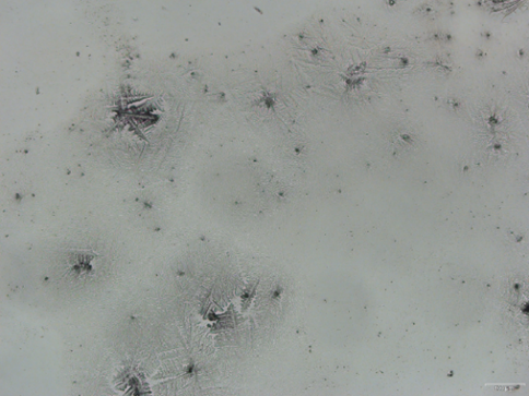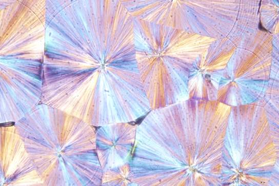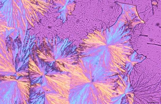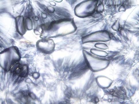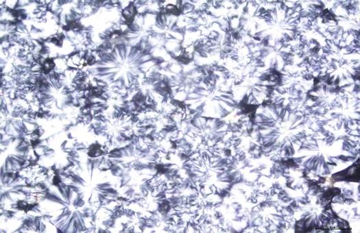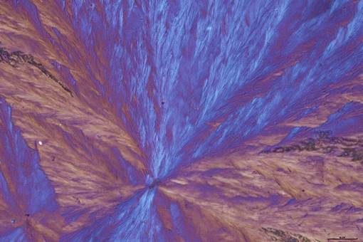 作品介绍: 聚丙烯简称PP为五大通用塑料之一,可用作日用品如衣架、脸盆。也可用于汽车零件制造。不同尺寸的球晶对PP性能影响极大。将聚丙烯粒料置于240℃ 的石英载玻片上加热熔融,随后加压成膜保温。再将样品转入恒温烘箱中保温 10 分钟,随后自然冷却。操作因素对球晶大小的影响,过小时无法观测到具体球晶。通过调整色温亮度对比度,使微观形貌呈现紫罗兰般浪漫美丽的画面。