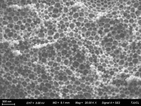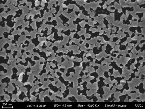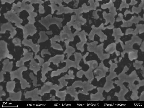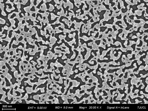 作品介绍:该纳米多孔金薄膜是利用磁控溅射在SiO2基底上溅射得到Au-Ge前驱体薄膜后,再用H2O2对Ge进行刻蚀后得到的。该制备纳米多孔金的方法与传统的脱合金法不同,制备过程不涉及强酸等危险性的溶剂,而且可以避免例如脱合金后残余活性组分的干扰,从而能制备得到纯度很高的纳米多孔金。由于该纳米多孔金是较薄的薄膜样品,且薄膜沉积在SiO2基底上,故在拍摄过程中极易出现在某一部位聚焦时调不清楚的情况,另外在某一部位长时间调焦时容易被打黑。