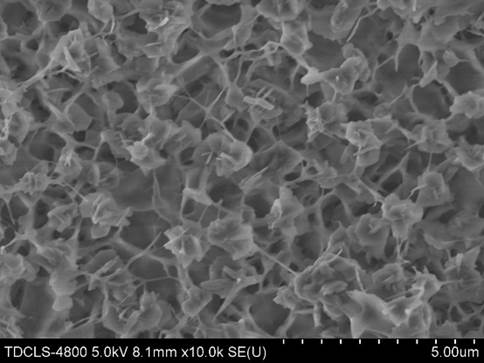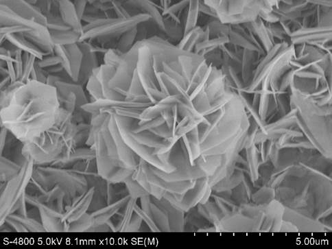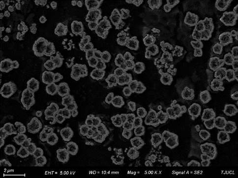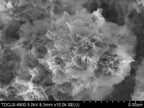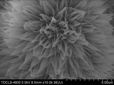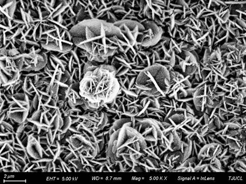 作品介绍:采用水热法制备了泡沫镍上负载的Zn-Co-S用于电催化水分解。样品在制备过程中,需要通过调节温度和时间,寻找最佳的制备参数以达到最高的电催化性能。它的新颖性在于研究了Zn的掺杂对电催化剂形貌和性能的影响。世间万物,息息相关。如果不看下面的标尺,以为这就是一朵完美绽放的菊花。不经感叹,在微观的世界,也存在着这么精致的花朵。它们在自己的小天地下静静的绽放。