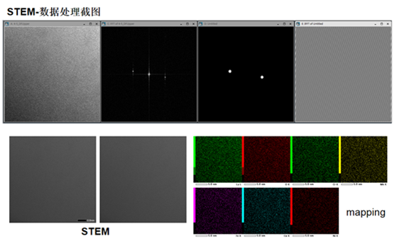 作品介绍:利用快速焦耳加热方式合成的高熵钙钛矿氧化物,利用铜网-微栅制样在F200-透射电子显微镜进行原子级别的元素mapping测试。STEM图片经过GM3软件FFT清晰化处理,中间大图是所有图片经过透明度处理叠加而成。 在非球差电镜的STEM下拍摄原子相并做mapping。选择合适的样品-晶界性良好,厚度适中,且稳定的样品,采用双倾杆转正带轴,经过精细调节拍摄STEM图片并做mapping。