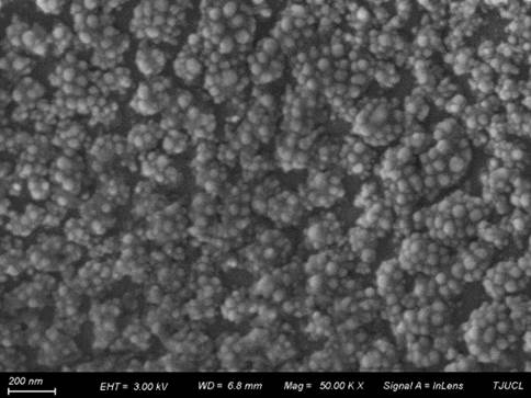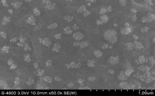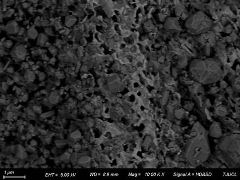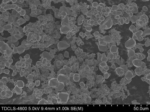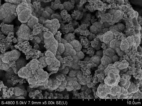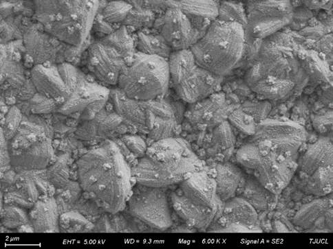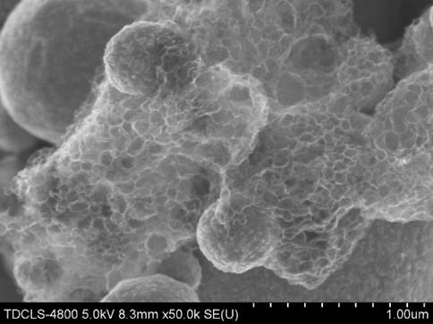作品介绍:p-DNB电极在0.5 M LiClO4 DME + 10% FEC电解液中放电,将电极片取出并拍摄扫描电子显微镜图像,以分析电化学反应机理。与不含FEC电解液放电图做对比,此图中的颗粒状物质为反应过程中产生的活性物质,说明在两种电解液中p-DNB电极的反应机理不同,需找到反应活性物质。