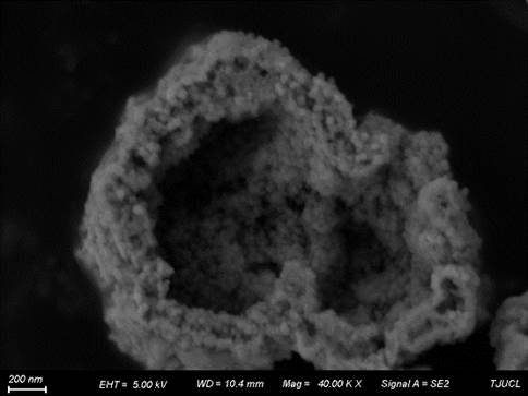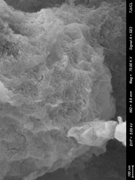 作品说明:我们采用直流电沉积法,可控制备出纳米颗粒堆砌组成的多孔Cu基空腔结构,合成十分困难。此类结构起到的限域效应,在CRR中具有良好的应用前景。在样品的拍摄过程中,样品的空腔结构会产生较大的景深,接触面积小导致导电性较差;兼顾景深的同时看到清晰的纳米颗粒,对电镜和拍摄手法有很高的要求。有一只纳米花生,它的外壳被导电胶束缚住了……诶?为什么只有壳?谁吃了我的花生?