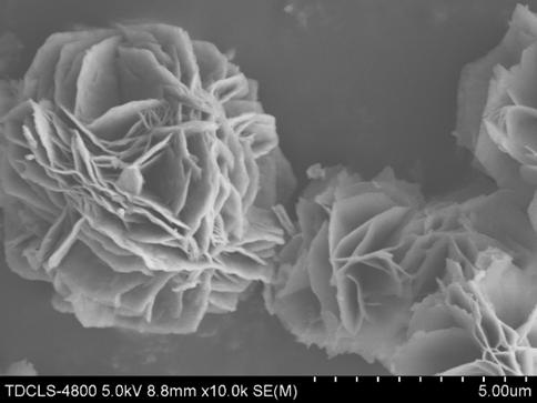 作品介绍:该样品是二硫化钼纳米花的冷场发射扫描电镜图像。该样品主要用于生物医用、润滑剂和抗磨剂等。用水热法在220 ℃反应24 h制备花状纳米级二硫化钼样品,水热反应需要严格控制酸度、反应时间以及高温高压的条件,因为这会影响纳米花的成核效果。将水热反应制备得到的沉淀进行多次离心水洗,最后冷冻干燥制备得到样品。取适量的样品粘在导电胶上,用于扫描电子显微镜拍摄。《花开富贵》——寓意着珍贵,雍容华贵的花型,夹杂着淡淡的花香,格外招人喜爱,也让人们更加懂得珍惜。