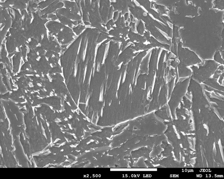 作品介绍:该显微组织的取样位置为埋弧增材样品的冲击试样垂直于断口截面的附近位置。将冲击试样切取部分位置加工成金相试样,经 180#至2500#的水磨砂纸进行手工粗磨、细磨,经机械抛光至试样表面无明显划痕后使用浓度为 4%的硝酸酒精溶液进行腐蚀。该显微组织照片是使用OLYMPUS GX51 高级金相显微镜拍摄出来的,材料为低碳钢,具体的工艺为在Q345B低碳钢的基板上进行埋弧增材,填充的焊丝型号为AWS EM12K,得到成形良好的厚壁结构件,切开取冲击试样,此显微组织为冲击功较低的冲击试样中断口附近的细晶组织。