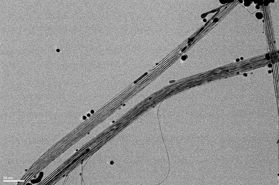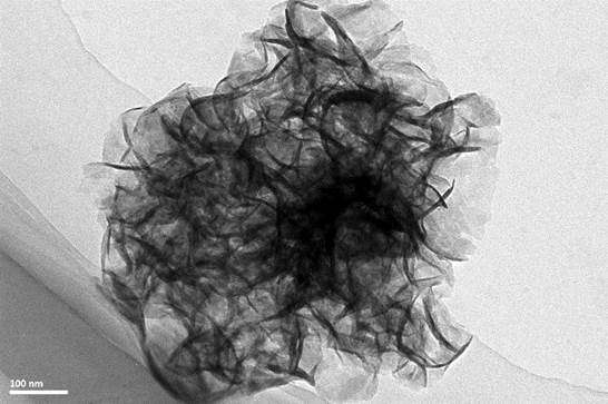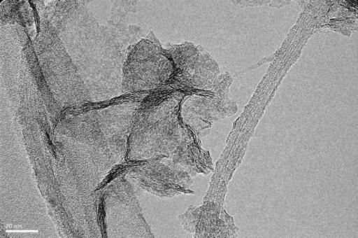 作品介绍:钠离子电池电极材料。样品为溶剂热法制备的MoS2/CNTs复合薄膜。纳米花状的MoS2附着于CNTs外壁,单壁CNTs管束交织形成网络,层层网络重叠形成薄膜。 “寄蜉蝣于天地,渺沧海之一粟。”复合材料薄膜的边缘似汹涌的海浪,二硫化钼纳米花在其中沉浮。