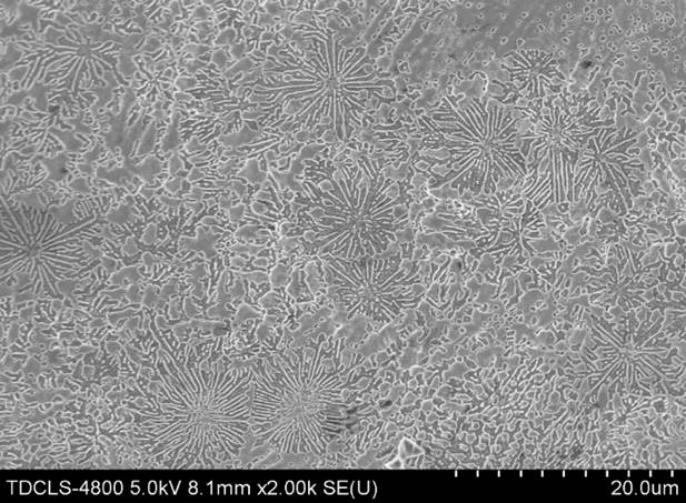 作品介绍:对于多相,高合金化的航空航天用Ni3Al基高温合金,其界面区由于错配度高、元素偏析等原因成为合金中的不稳定区域,在时效过程中,析出相易在此处析出并呈现形貌,尺寸的演变。本作品采用材料学院S4800冷场发射扫描电镜进行拍摄,由于界面区易腐蚀,所以腐蚀时间的把握是呈现本作品的主要难点。界面区析出相随着时效时间的延长从图中颗粒状生长为短棒状,最终呈现花状,恰似一个种子破土发芽,生长开花的过程,故作品称之为“花开好了”。