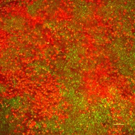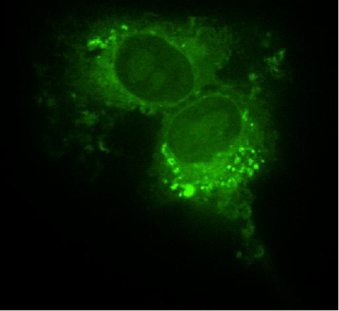 作品介绍:多肽因其高生物相容性被广泛用作药物递送的载体。本作品使用的多肽可以在递送基因药物的同时在癌细胞表面与内部选择性的形成膜来杀死癌细胞。图片为经过多肽处理,溶酶体染色后的癌细胞图片。因为本作品设计的多肽具有特殊的成膜和在癌细胞溶酶体内分解的性质,导致其在癌细胞内观察到溶酶体溶胀现象,这是需要控制多肽的序列、浓度以及反应时间等多种条件得到的创新性结果。本作品通过材料学院的激光扫描共聚焦显微镜拍摄。本作品未添加任和艺术处理。