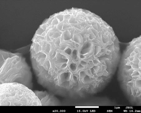 作品介绍:高性能正极材料的开发成为锌离子电池发展的关键。锰基材料具有低成本、资源丰富、且对环境友好而受到了大量关注并被广泛研究探讨。合成新型的氧化锰微米球,由于该材料含有四价和二价锰,是一种新型锰基正极材料,十分有利于电化学性能的改善。样品存在一定的景深,比较难拍照。