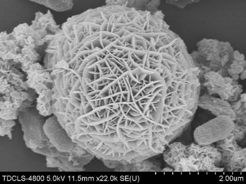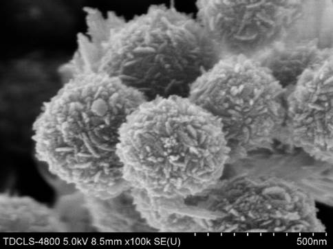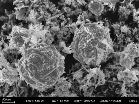 作品介绍:材料为钒酸铜,应用于光电催化及锂离子电池领域。该样品通过水热法合成,通过控制原料比例及反应温度可以获得不同形貌的钒酸铜,该样品形貌本应为纳米片堆垛成的纳米花球状,然而在拍摄的过程中发现其中含有一些纳米棒插在纳米花之间。