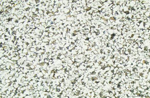 作品介绍:5钢是一种优质碳素结构钢,含碳量在0.4%-0.5%之间,硬度不高,易切削加工。广泛应用机床上的齿轮,或者是中载的钻床变速器,但不适作高速或者高负载的齿轮。调节箱式电阻炉加热温度后恒温区保温,进行炉冷(退火),然后依次进行磨制、抛光、浸蚀等工序,其中,试样采用手磨,抛光在抛光机上进行。本样品使用CX40M金相显微镜拍摄放大倍数为×500和×100的图片,图中黑色部分为片状珠光体,白色部分为铁素体。