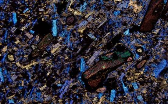 作品介绍:本参赛作品为角闪石,一般为镁、铁、钙、钠、铝等的硅酸盐或铝硅酸盐。是分布很广的造岩矿物之一,常有完好的单晶体出现,呈柱状。角闪石具有一定的经济价值,是制造玉器等工艺品的矿物原料之一。在拍摄过程中,遇到了不少的难点,例如在视野中寻找稳定且美观的晶型图像,调试合适的放大比例,并对不同晶型进行了不同的上色处理,最终呈现出了最终的照片。该作品在清晰的放大比例下,为不同的晶系晶型呈现了不同的颜色,使得整个图片更加的清晰美观,体现了作品的自然性和美观性。