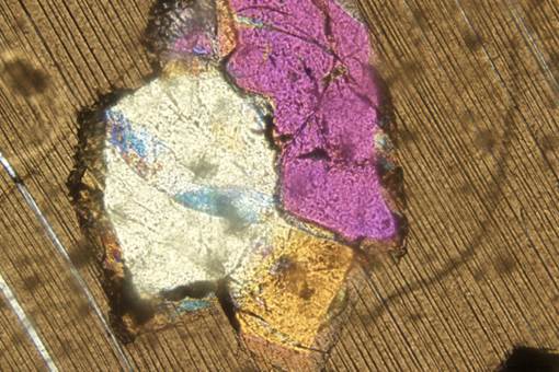 作品介绍:在拍摄过程中捕捉到有一块黑色以及复杂形状的尖角,尖角内部颗粒繁多,形状复杂。周围分布有棕色的色块,周围混有粉色的组织,在偏振光的作用下组织呈现出斑斓的颜色。黑色尖角中分布的细小颗粒像是一座诚实的俯瞰图,各色各样的屋顶,建筑在俯瞰图中都缩成了一个个小点,周围平整的区域就像是城外的郊区,显得很平静。