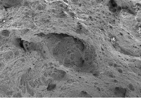 作品介绍:样品材料为建筑工程领域常用的铸钢。样品为进行力学性能试验所制备的标准断口试件。断口形貌及其复杂,想要在其中找出具有一定美感的图片存在难度。本图片中,为突出图片中坑底的规则纹路,进行了光学处理。