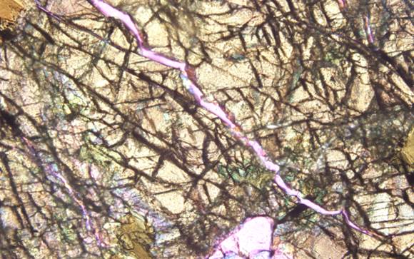 作品介绍:拍摄的黑云母组织切片中,灰色的裂纹象征着干枯的大地,龟裂又贫瘠的土地上寸草不生,一片枯萎的景象,这是紫色的河流就像是天河一样流经这片土地,在裂缝中逐渐扩散,滋养了这片土地,使这片干裂的土地重新焕发了生机。